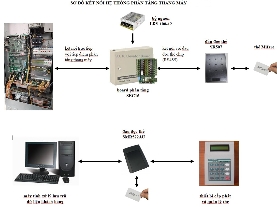 – Nếu hệ thống ở cơ chế Offline (toàn bộ hệ thống không kết nối với máy tính lưu trữ dữ liệu khách hàng): Board phân tầng sẽ đọc dữ liệu thông tin khách hàng được lưu trữ trực tiếp trong Bộ nhớ của thẻ (thẻ Mifare có bộ nhớ trong 1KByte) để thực hiện việc phân tầng thang máy cho phù hợp. Sau đó lệnh điều khiển phân tầng thang máy sẽ được Board phân tầng truyền trực tiếp đến Tủ điều khiển Thang máy hoặc tác động trực tiếp đến bàn phím chọn Tầng của Thang máy